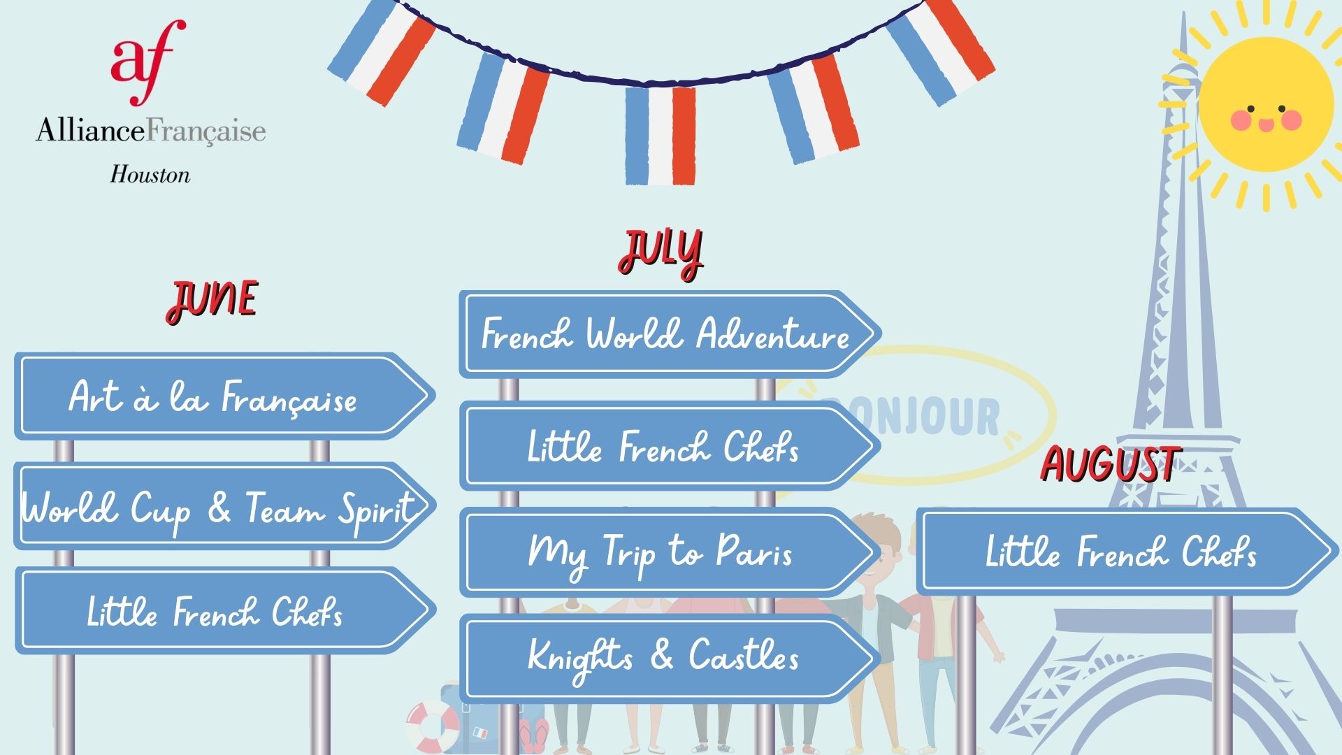Give your child a summer full of creativity, culture, and confidence at the Alliance Française of Houston. Our Summer Camp offers a fun and immersive introduction to the French language through games, arts, sports, cooking, and themed adventures—no prior French required!