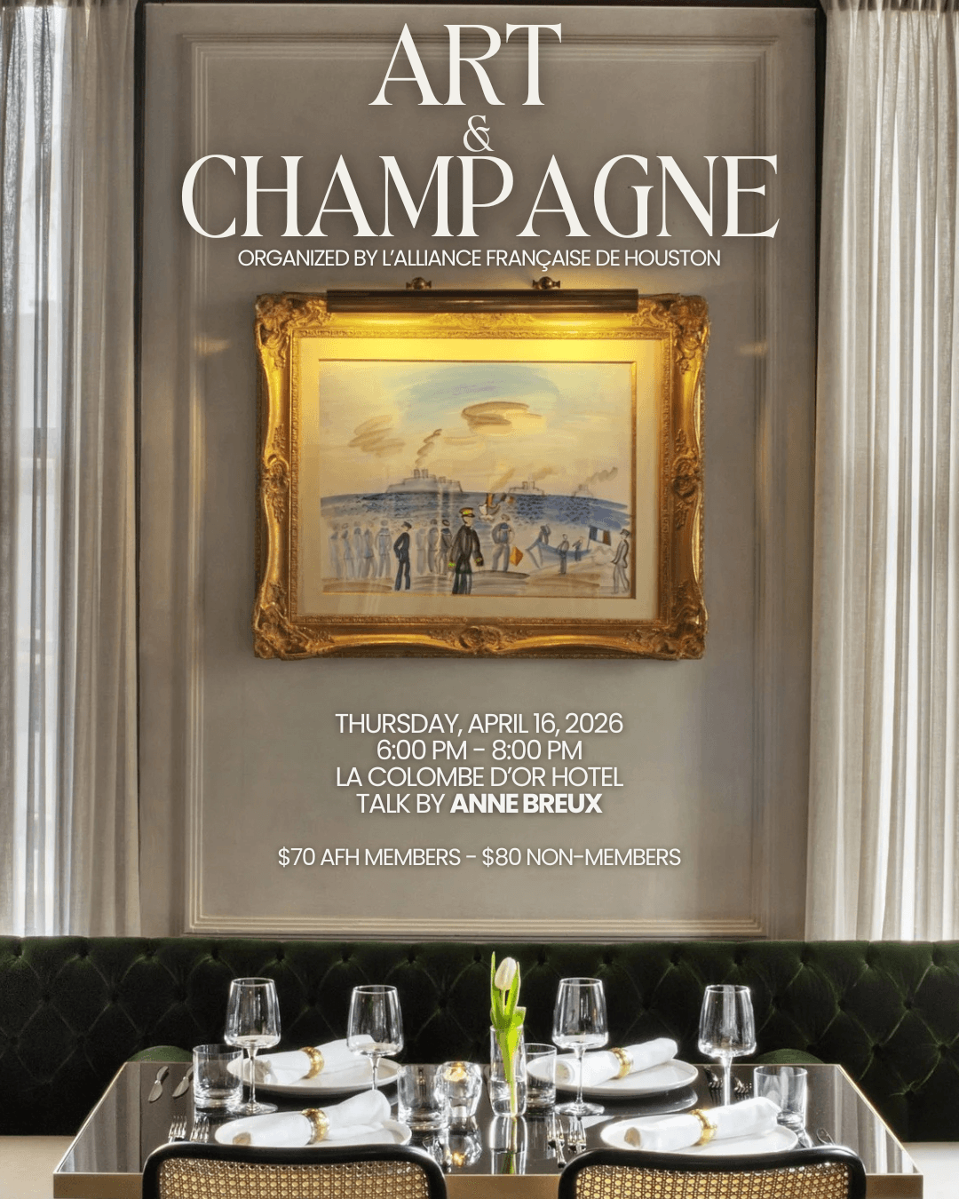 Join us for an elegant cultural evening, organized by L’Alliance Française de Houston at the iconic La Colombe d’Or Hotel.